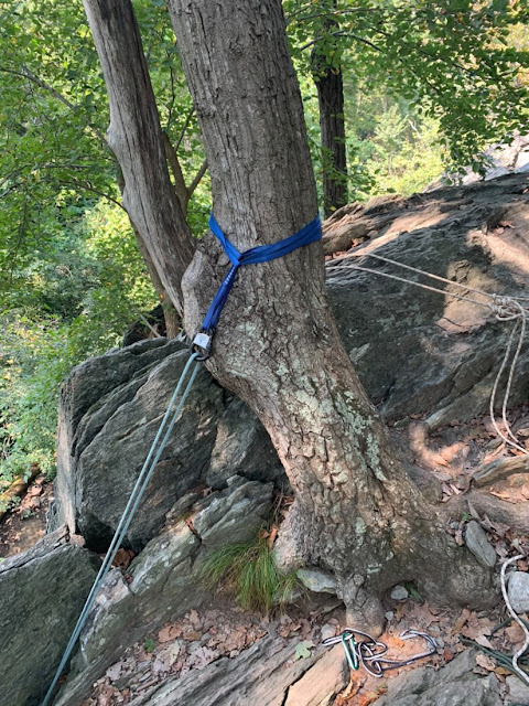Part 1: A skinny tree with single strand webbing wrapped high, secured with a single carabiner. It was an attempt at a frictionless anchor but poorly executed.